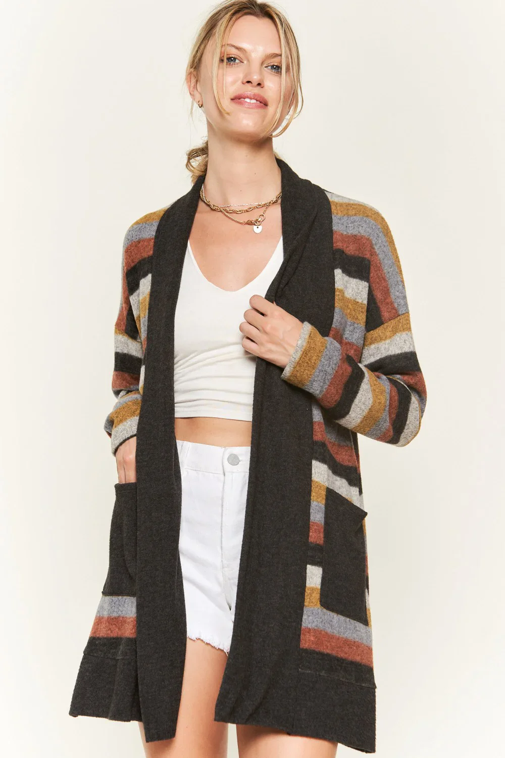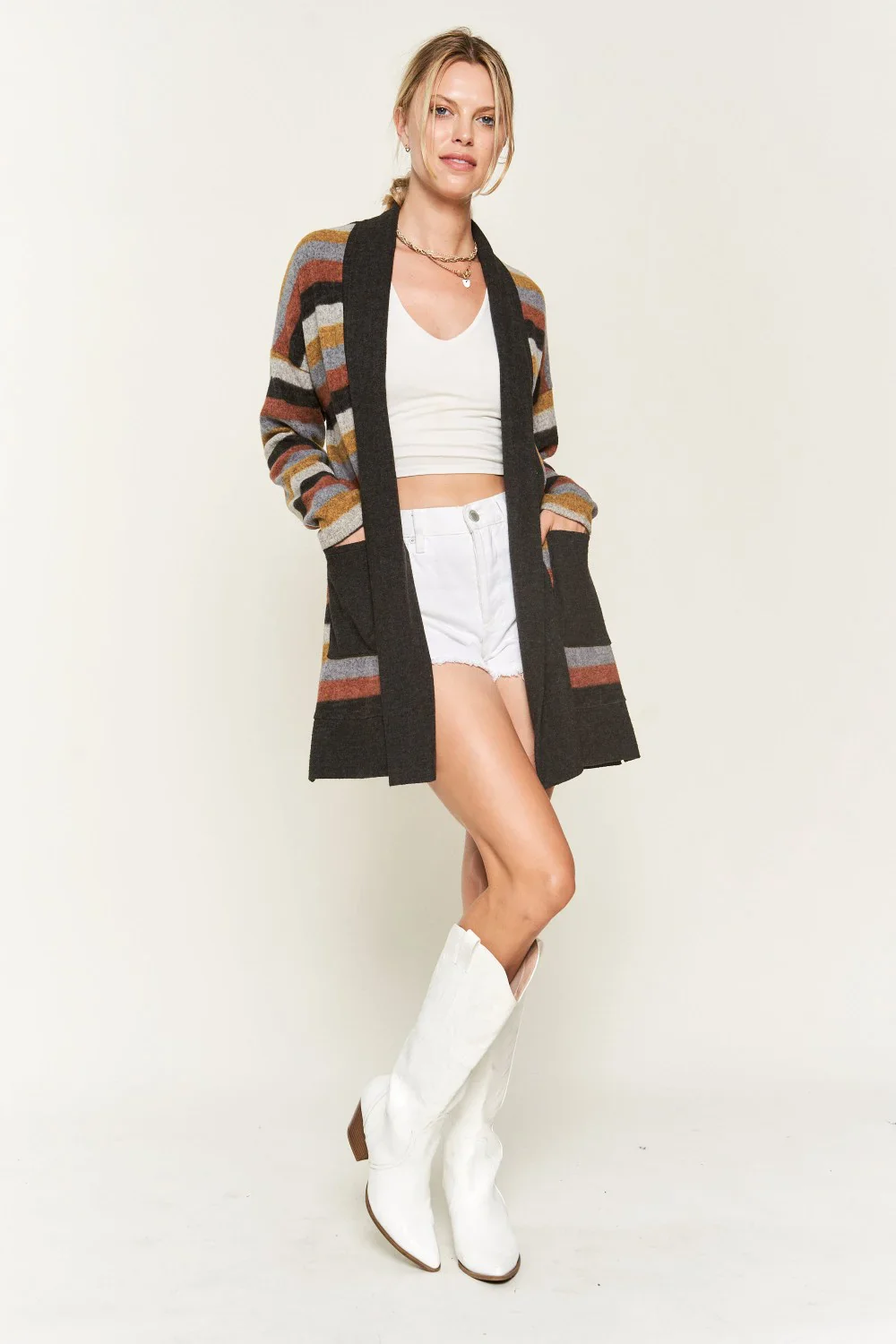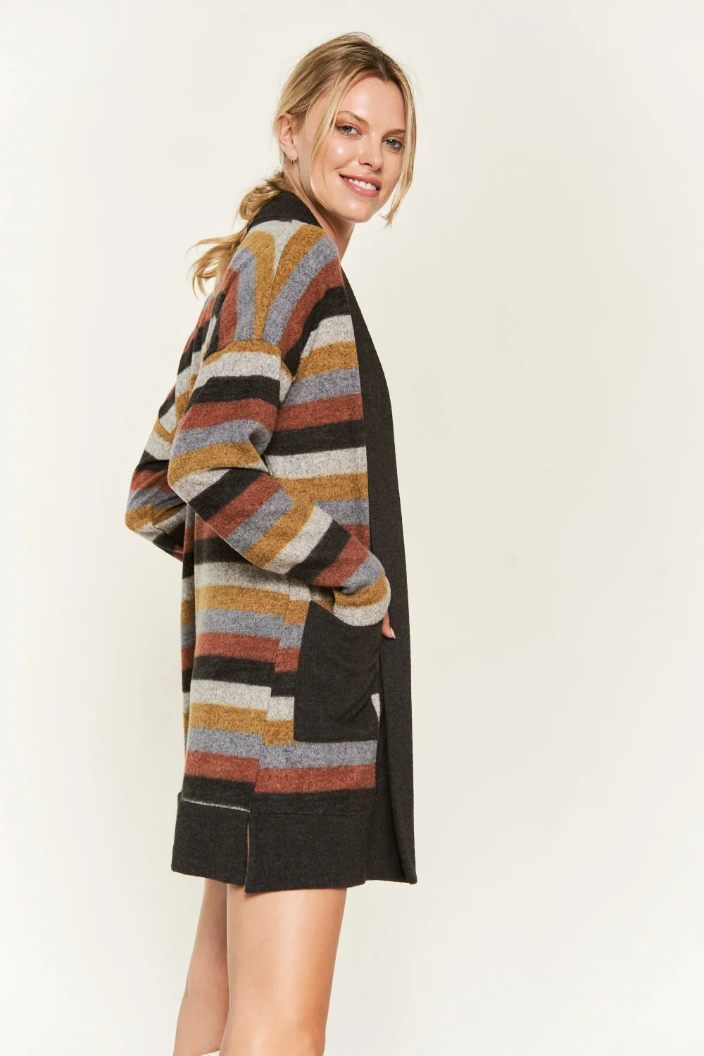 Plus Size Western Striped Open Front Long Sleeve Oversized Longline Knit Cardigan