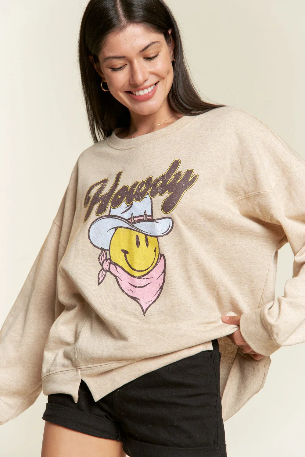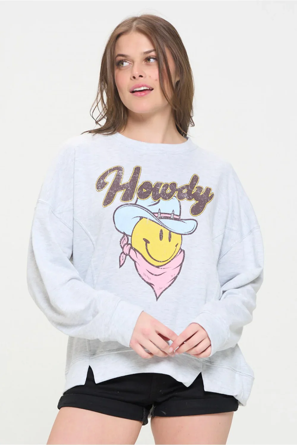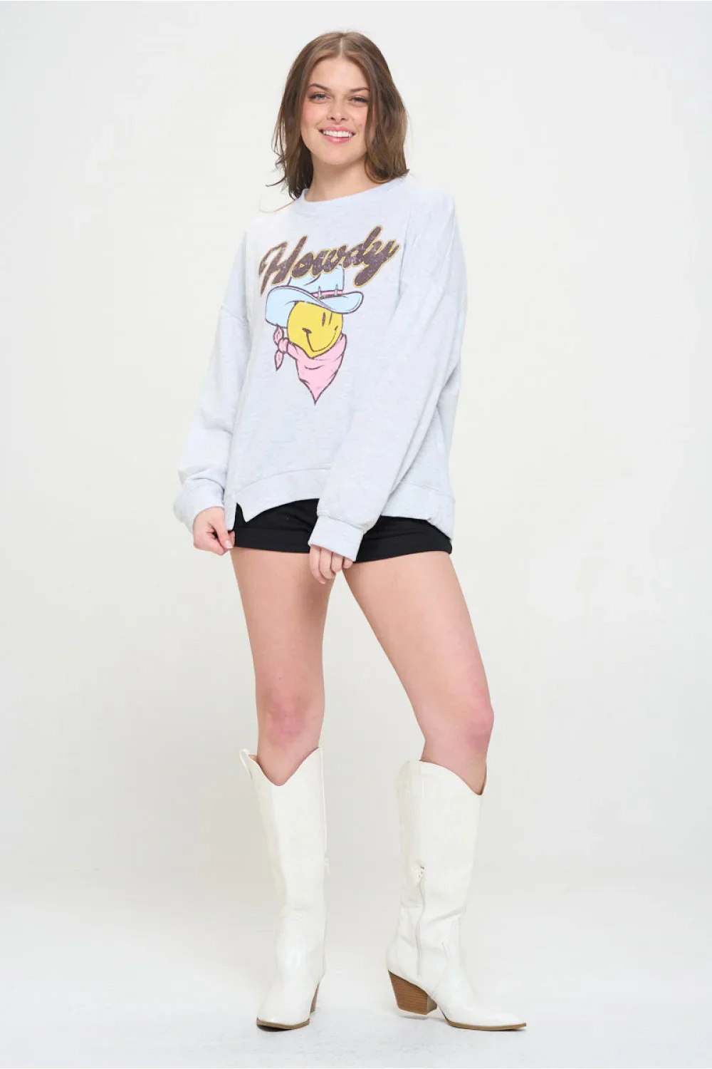 Plus Size Howdy Smiley Face Graphic Oversized Crew Neck Casual Pullover Sweatshirt