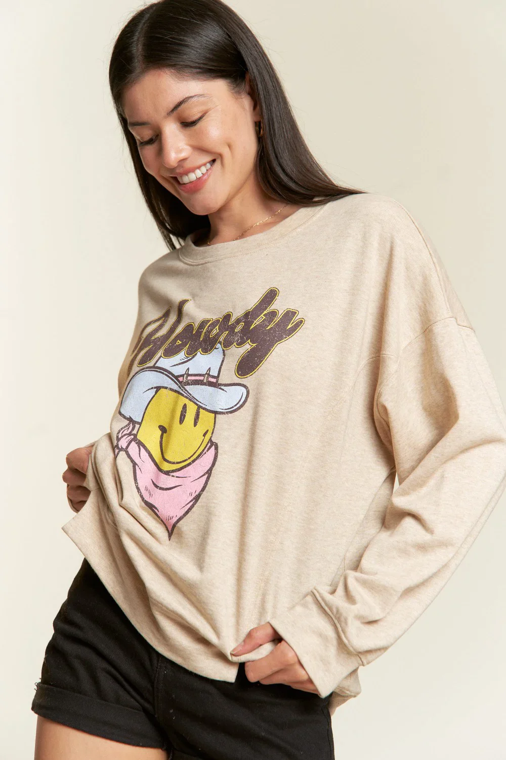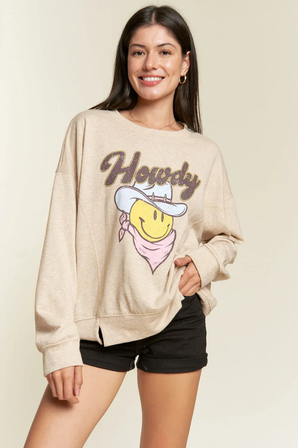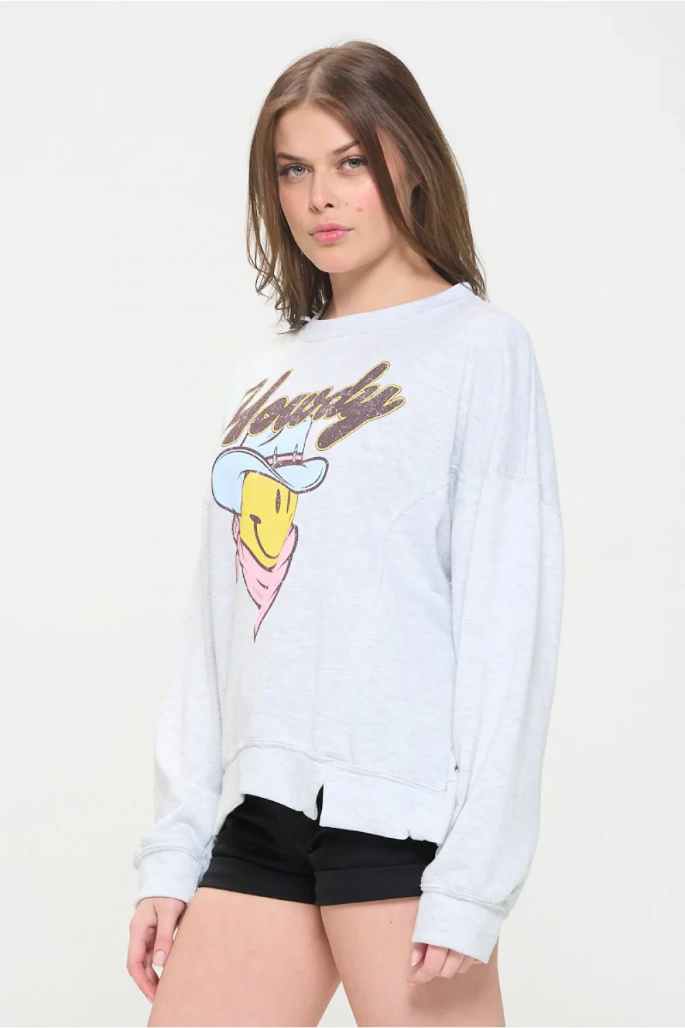 Plus Size Howdy Smiley Face Graphic Oversized Crew Neck Casual Pullover Sweatshirt