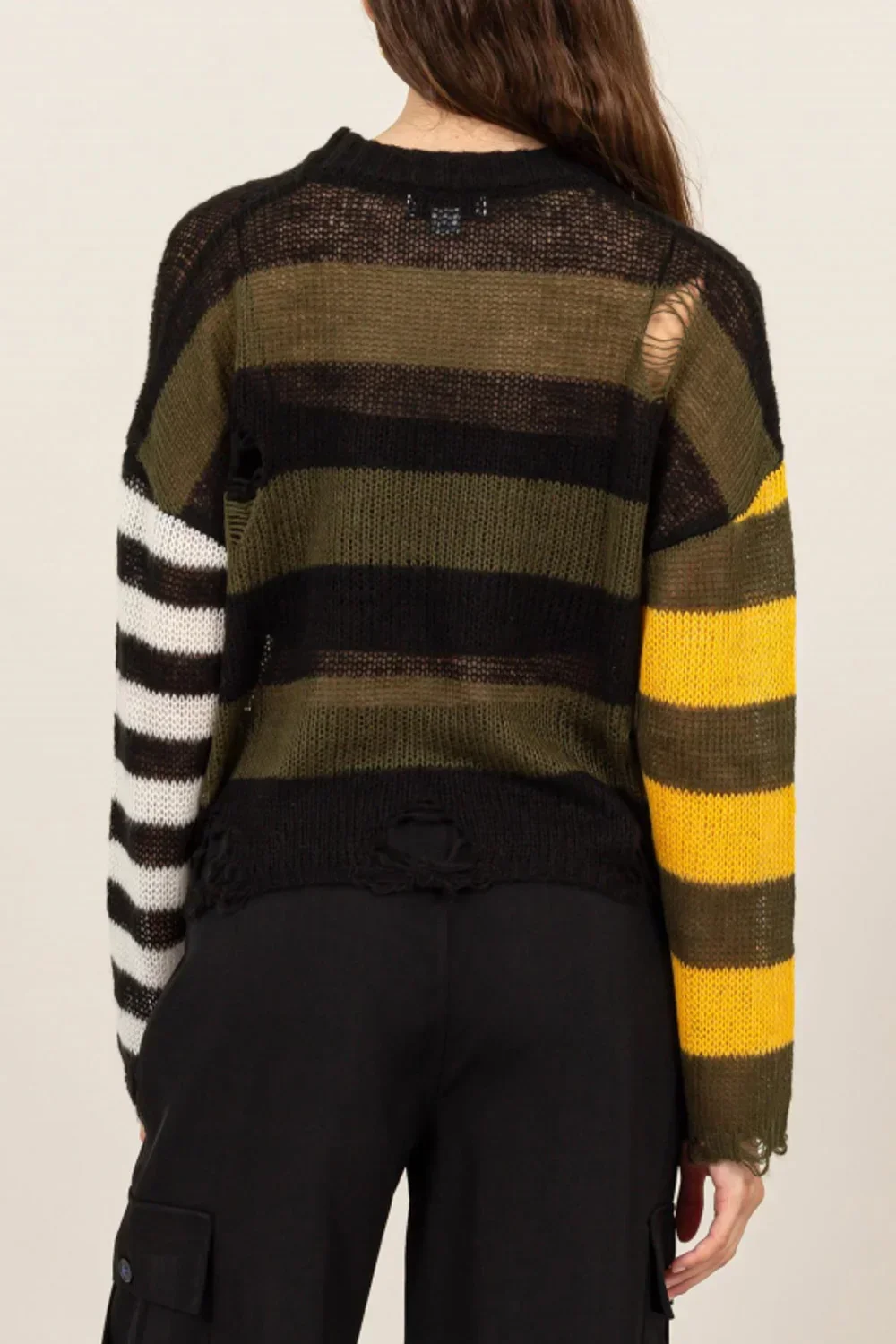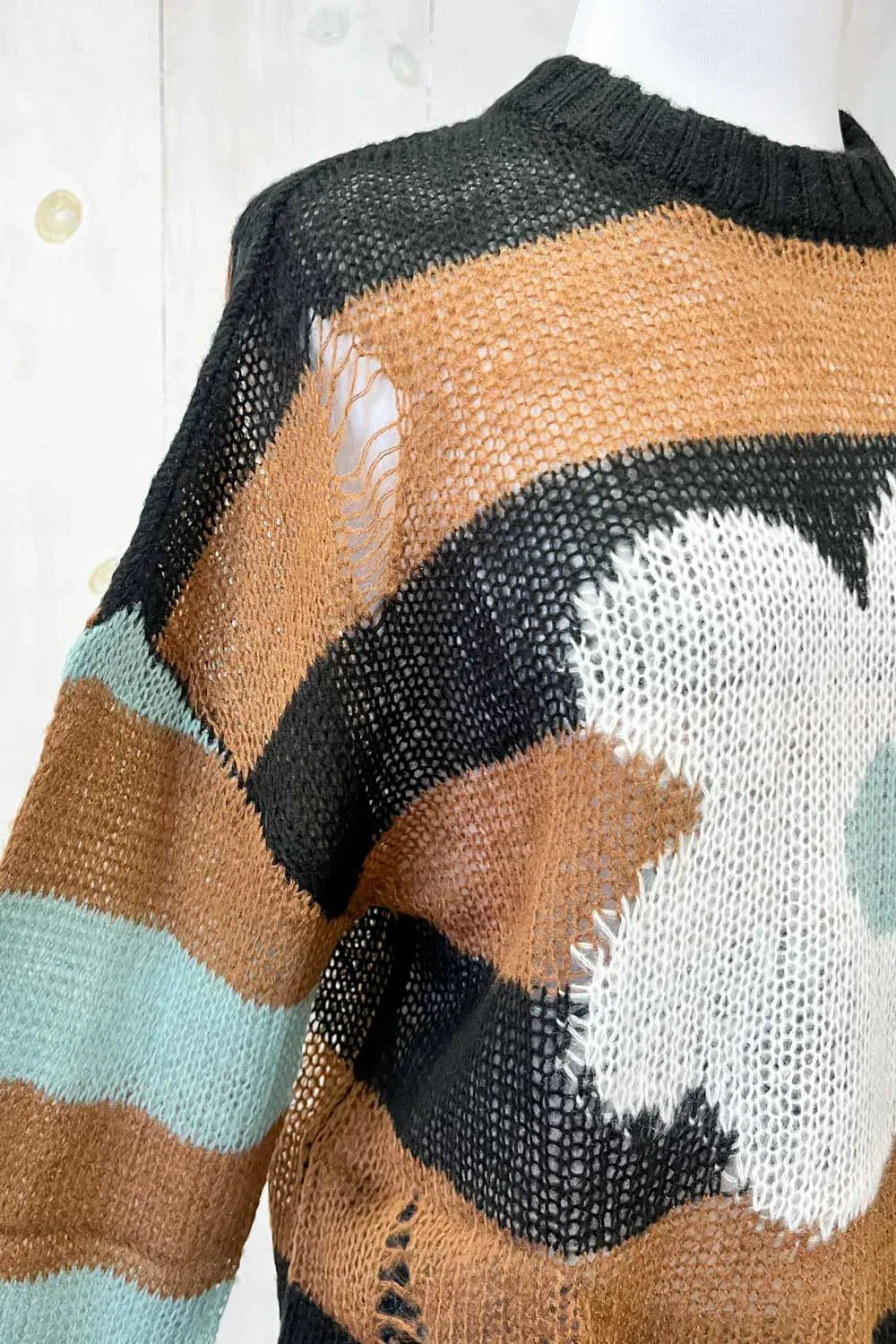 Colorblock Daisy Floral Print Distressed Mock Neck Lightweight Sweater