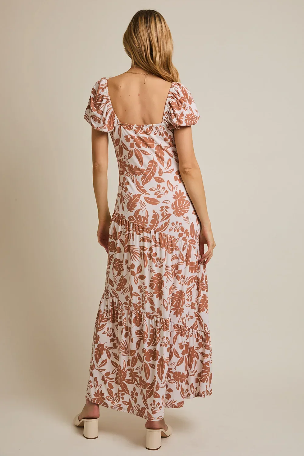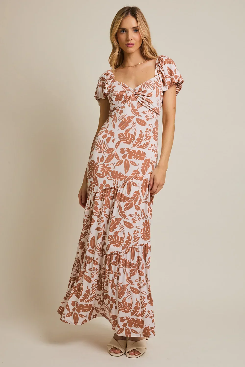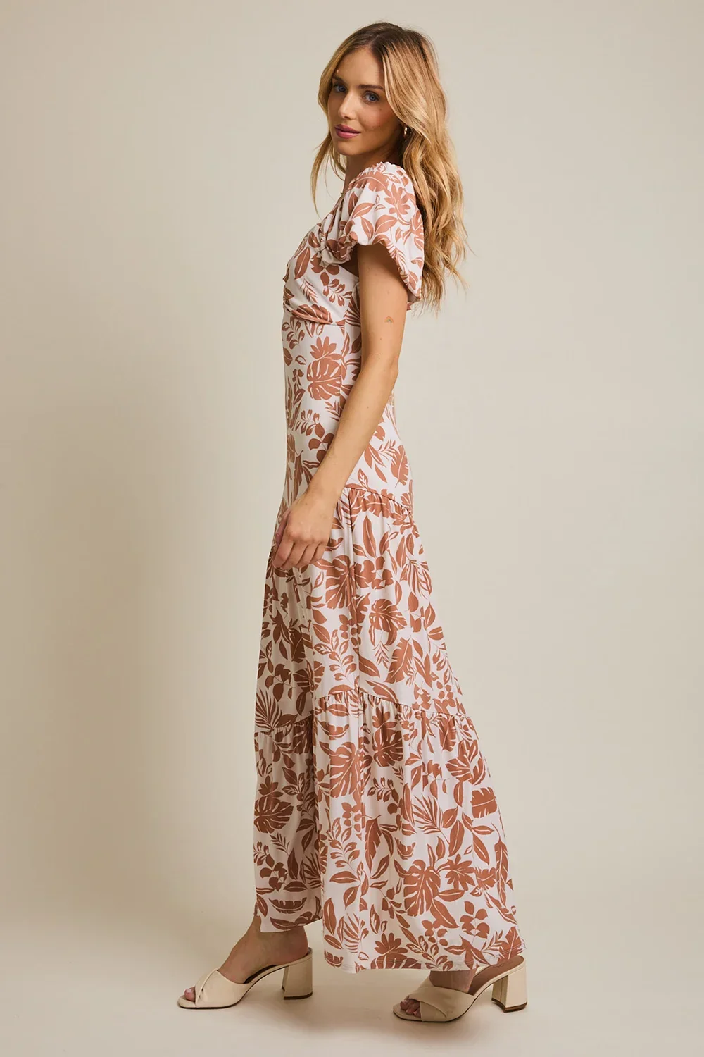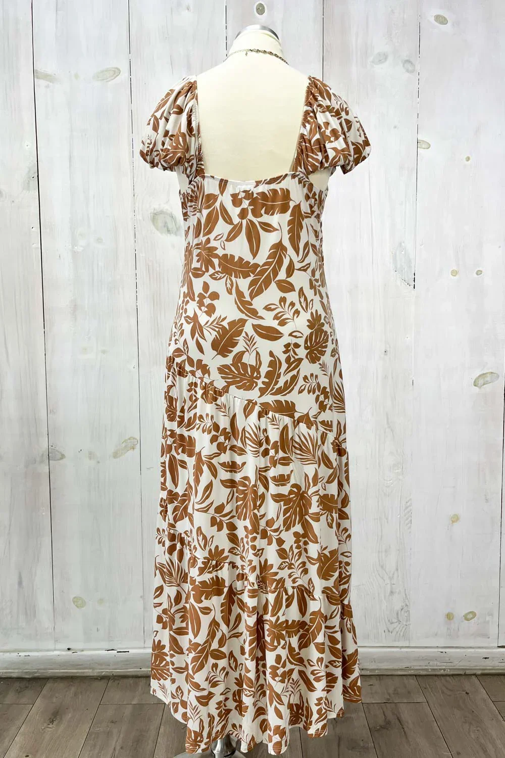 Plus Size Cream Brown Tropical Leaf Print Sweetheart Neck Short Sleeve Maxi Dress