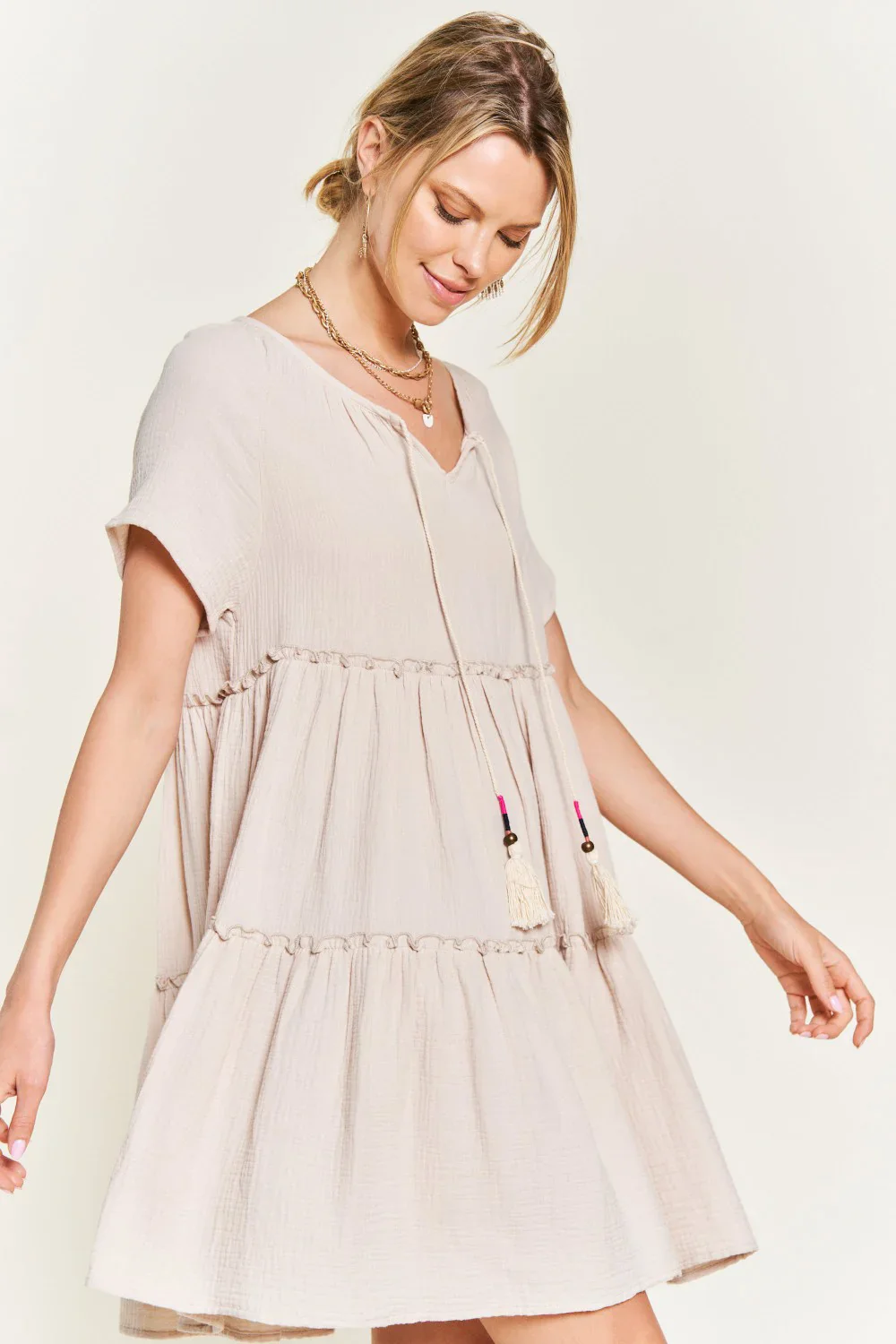 Plus Size Tiered Babydoll Short Sleeve V Neck Tassel Tie Casual Summer Swing Dress