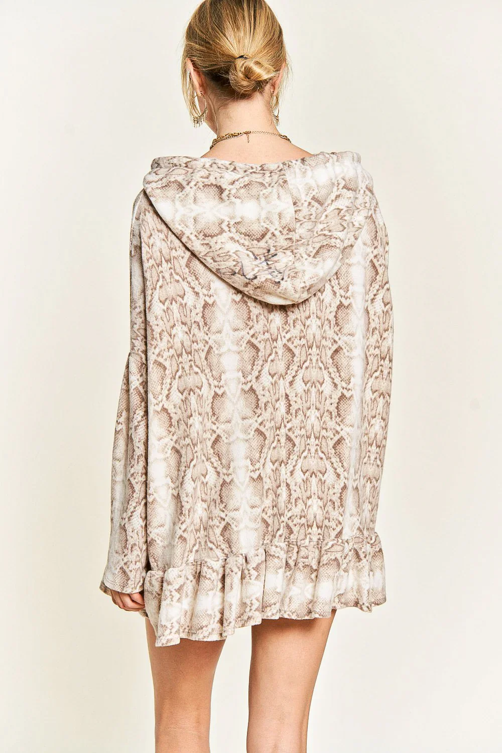 Plus Size Snakeskin Print Hoodie Drawstring Long Sleeve Tiered Ruffle Tunic Top
