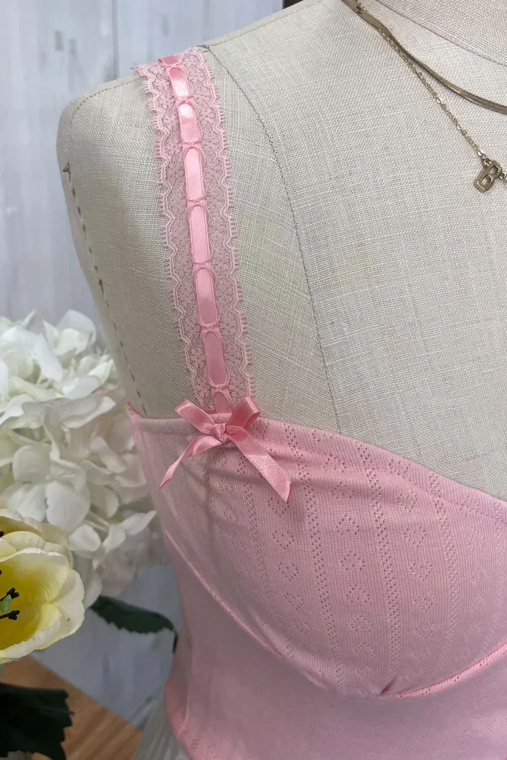 Ribbed Knit Button Front Corset Bustier Delicate Lace Trim and Bow Details Top